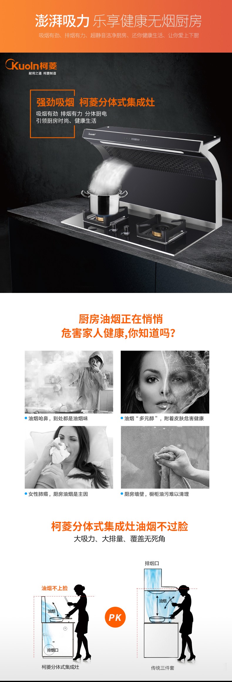 分体式集成灶,又称下排式油烟机,是建立在传统三件套和普通集成灶基础上发明的一种新式厨房抽油烟设备。它的外观时尚,智能化程度高,油烟吸排率基本能保持在95%以上,非常适合现代的开放式厨房。